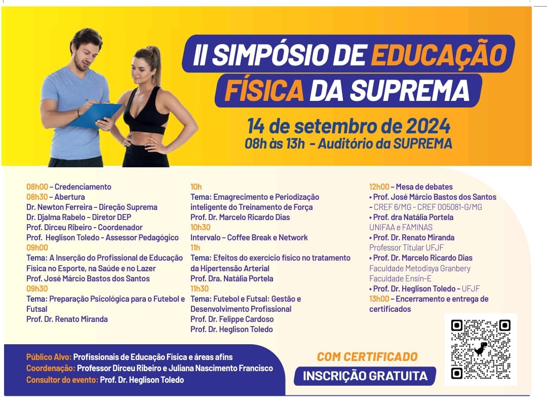 Foi realizado no sábado dia 14 de setembro de 2024 no anfiteatro da Suprema, o II Simpósio de Educação Física da Suprema, com diversos professores renomados, em diversas áreas do conhecimento;