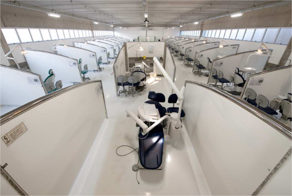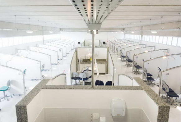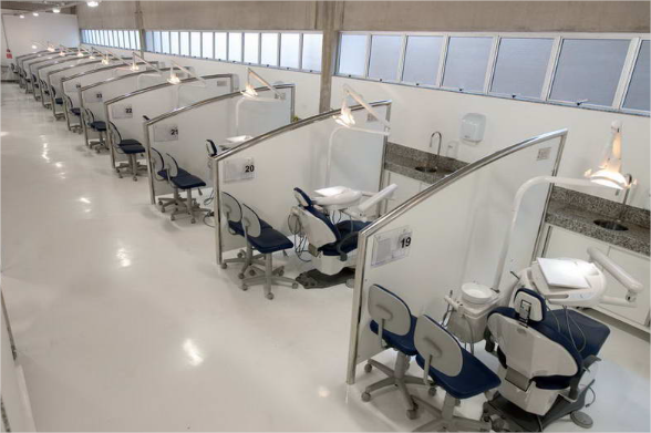 As clínicas possuem ainda 24 aparelhos fotopolimerizadores compatível com todas as resinas compostas disponíveis no mercado e ativadas pela energia da luz visível; módulo de alimentação revestido por uma capa plástica em ABS; circuito eletrônico controlado por um microcontrolador com software; dispositivo multi-tensão com comutação automática entre 100 a 240 VCA - 50/60 Hz; peça de mão leve e anatômica interligada ao módulo de alimentação através de um cabo extensor espiralado e liso nas extremidades; gatilho soft start com comando inteligente, programação do tempo através de dispositivo pré-selecionado de 10 em 10 segundos, até 50 segundos, emitindo um bip sonoro a cada 10 segundos; lâmpada halógena de 12VCA x 75W, com espelho dicróico; potência luminosa nominal entre 350 e 500 mW/cm2; troca da lâmpada pelo próprio operador, sem necessidade de uso de ferramentas; filtro óptico que converte a luz da lâmpada halógena no intervalo do comprimento de onda de 400 e 500 nm (nanômetro); filtro térmico que assegura baixa temperatura, impedindo aquecimento no dente; exaustor de ar silencioso; ponteira condutora de luz em fibra óptica rígida e semi orientada, revestida em aço inox, autoclávavel, com diâmetro de 11mm x 84mm de comprimento, acompanha quatro cápsulas para serem colocadas na extremidade da ponteira visando proteção ocular do operador e assistente, e obstrução das fibras ópticas; acabamento liso na cor branco; chave geral liga/desliga.