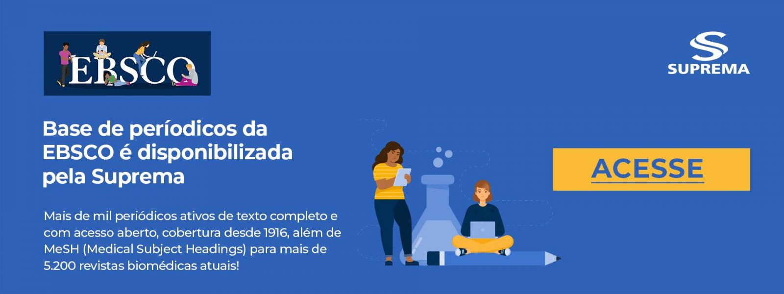 A Biblioteca FCMS/JF - SUPREMA dispõe da base de dados EBSCO, que contempla a Medline Complete, Medline Ultimate e Fonte Acadêmica, as principais bases de dados de periódicos biomédicos e de saúde, que fornecem texto completo para milhares de principais revistas com indexação de capa a capa. É uma ferramenta de pesquisa essencial para médicos, enfermeiros, fisioterapeutas, farmacêuticos, cirurgiões dentistas e demais profissionais de saúde. Configura-se como recurso essencial para pesquisa biomédica, garantindo uma ampla gama de assuntos, incluindo ciência pré-clínica, desenvolvimento de políticas de saúde e outros. A MEDLINE oferece fontes de informações diferenciadas para cada pesquisador, sua cobertura inclui 1.200 periódicos ativos, em texto completo, de acesso não aberto e que não estão disponíveis em qualquer versão da Academic Search, possui também conteúdo Ahead of Print para títulos relevantes de editoras chave, além do MEDLINE Complete Subject Headings, que ajuda os usuários a pesquisar e recuperar informações de forma eficaz e a seguir a estrutura do Medical Subject Headings (MeSH) utilizado pela National Library of Medicine.