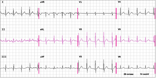 Mais frequentemente, o ECG revela taquicardia e várias alterações na onda ST-T, que não são específicas para embolia pulmonar (ver figura ECG na embolia pulmonar). O padrão S1Q3T3 ou um novo bloqueio do ramo direito pode indicar o efeito da elevação abrupta no tamanho do ventrículo direito na vias de condução no ventrículo direito; esses achados são moderadamente específicos, mas insensíveis, ocorrendo apenas em cerca de 5% dos pacientes, embora os achados ocorram em um percentual maior dos pacientes com embolia pulmonar maciça. Pode haver desvio do eixo para a direita (R > S em V1) e P-pulmonale. Também ocorre inversão da onda T, de V1 para V4.